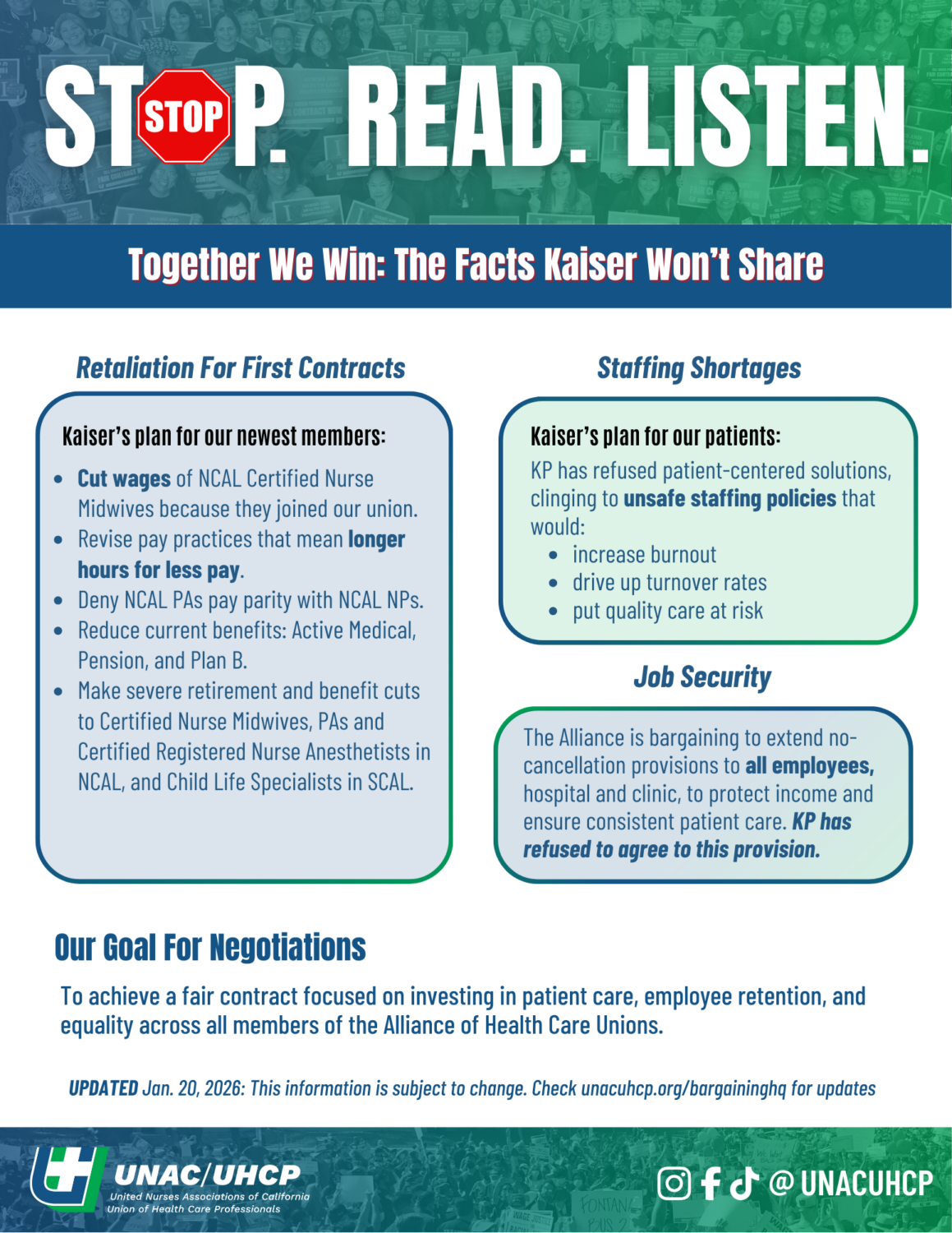 Sticker days. Rallies. Big bargaining turnouts. Show our power by posting to your social platforms and tagging @unacuhcp. Use the #TogetherWeRise hashtag to help followers see how united and strong we are.